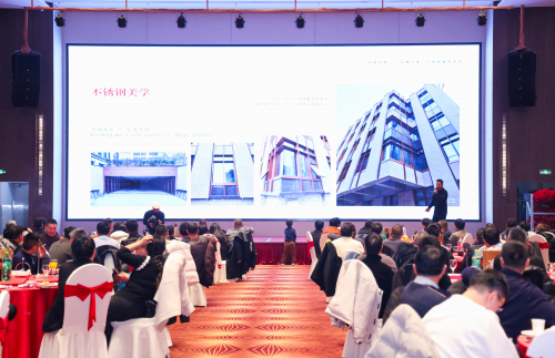 在稳固传统优势产品市场地位的同时,创安门业敏锐捕捉到市场对建筑美学的高端需求,于近期年会上重点介绍了其不锈钢美学系列产品。该系列产品创新运用PVC镀钛等先进工艺,为不锈钢材质打造出金色、玫瑰金、黑钛等多款高端色泽,同时支持镜面、拉丝、蚀刻等多元表面处理方式,可灵活适配不同建筑的美学风格,精准彰显空间质感。值得关注的是,创安门业在打磨产品视觉表现力的同时,始终坚守产品核心功能,该系列产品内部可填充防火芯材,实现美观与安全的双向兼顾。