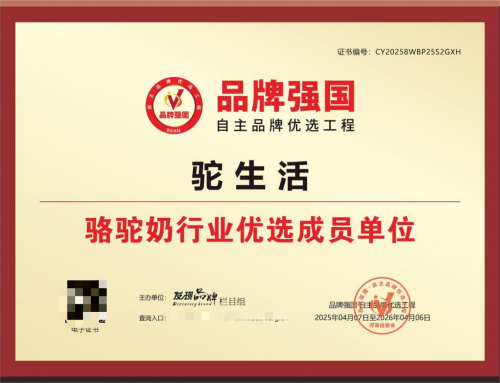 驼生活对驼奶品质的执着追求,赢得了行业与相关机构的认可。品牌已入选“品牌强国自主品牌优选工程”,并成为该工程中骆驼奶行业的优选成员单位,这标志着驼生活品牌建设与产品品质达到了相关标准。