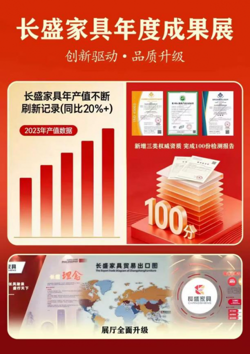 步入2025年至2026年这一重要阶段,长盛家具的年产值持续刷新纪录,同比增长超过25%。并集中发力产品品质认证,新增了三类权威资质认证,相继完成100份产品检测报告,覆盖原材料环保性、力学性能及安全防护等关键维度,成功斩获低甲醛、防火阻燃、防腐、抗菌等多项权威认证,以及中国绿色产品认证和ISO50001能源管理体系认证。尤为值得一提的是,适老家具产品认证的取得,更彰显了品牌对细分场景的专业深耕能力。
