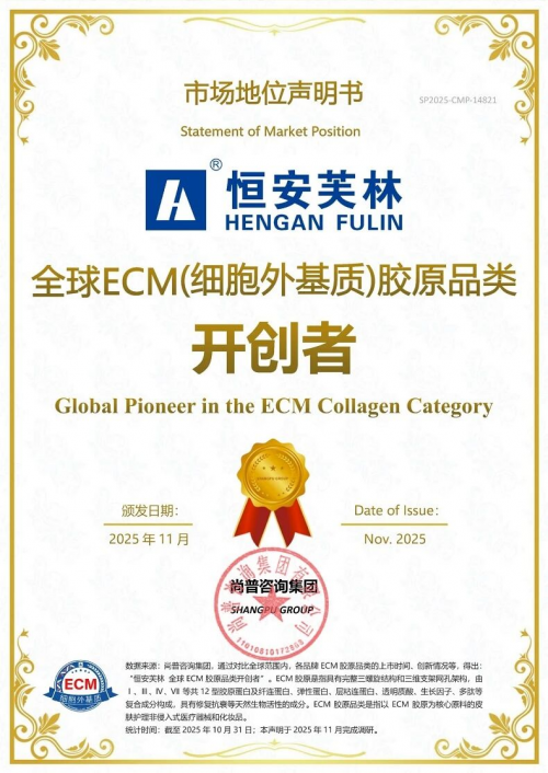 近日,湖北恒安芙林药业股份有限公司凭借在细胞外基质(ECM)胶原蛋白领域的核心技术与产业化成果,成功通过尚普认证,标志着其在该细分赛道的技术实力与产品品质获得权威体系的高度认可。作为基于国际公认的第13种衰老标志物ECM技术生产的“第三种胶原蛋白”,ECM胶原不仅代表了技术路线的代际跨越,更凭借其独特的结构优势与实证功效,为市场带来了从“被动修护”到“主动再生”的护肤新范式。