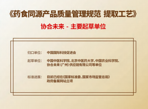 在此背景下,国家层面持续推进全民营养健康与标准化建设,一系列政策文件为药食同源产业的规范化发展指明了方向。作为行业内的优秀企业代表,协合未来(广州)供应链有限公司(以下简称“协合未来”)凭借扎实的技术积累与行业影响力,受邀参与《药食同源产品质量管理规范 提取工艺》团体标准的制定工作,以实际举措应对行业痛点,为产业注入标准化发展的新动力。